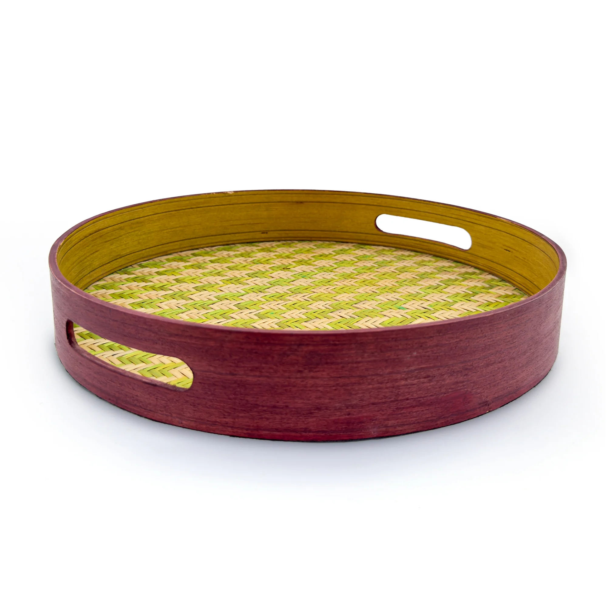 Description: Round tray, made out of bamboo, used in multiple purpose such as wall decor, tea tray.